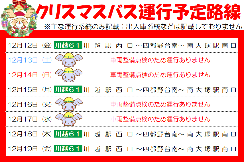 川越で「エンジェ」のラッピングバスが走り出すよ~(クリスマスバス運行情報)12月13日更新