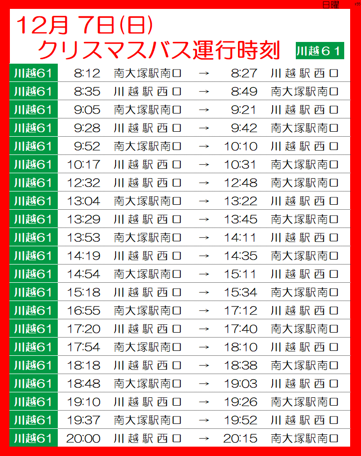 たくさんのお友だちに乗ってほしいから、土曜・日曜、12月24日(水)クリスマスイヴ、12月25日(木)クリスマスに限り、運行時刻をこのページに掲載します!