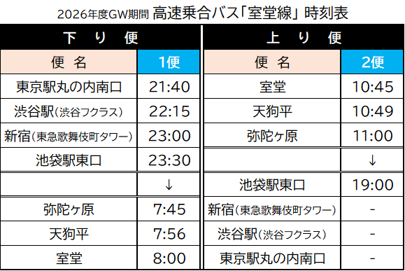 上り:室堂・天狗平・弥陀ヶ原→池袋 ※上り便は池袋止まりです