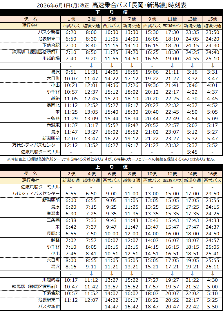 6月1日(月)高速乗合バス「長岡・新潟線」のダイヤ改正について 2026.04.28 高速バス・空港連絡バス 日頃より、西武の高速バスをご利用くださいましてありがとうございます。高速乗合バス「長岡・新潟線」は、2026年6月1日(月)にダイヤ改正を実施いたします。ご利用のお客さまは、あらかじめご確認いただきますようお願いいたします。 ダイヤ改正について(6/1出発便から) 画像はクリックで拡大します 運賃等、路線についてのご案内は以下のリンクよりご確認ください。